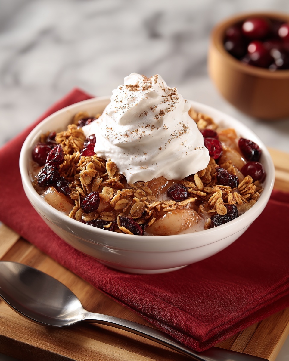 A scoop of vanilla ice cream or a dollop of whipped cream takes this Apple Cranberry Crisp Recipe to the next level with creamy coolness balancing the warm fruit and crisp topping. For an extra touch, sprinkle chopped toasted pecans or a pinch of cinnamon on top for a visually inviting finish.