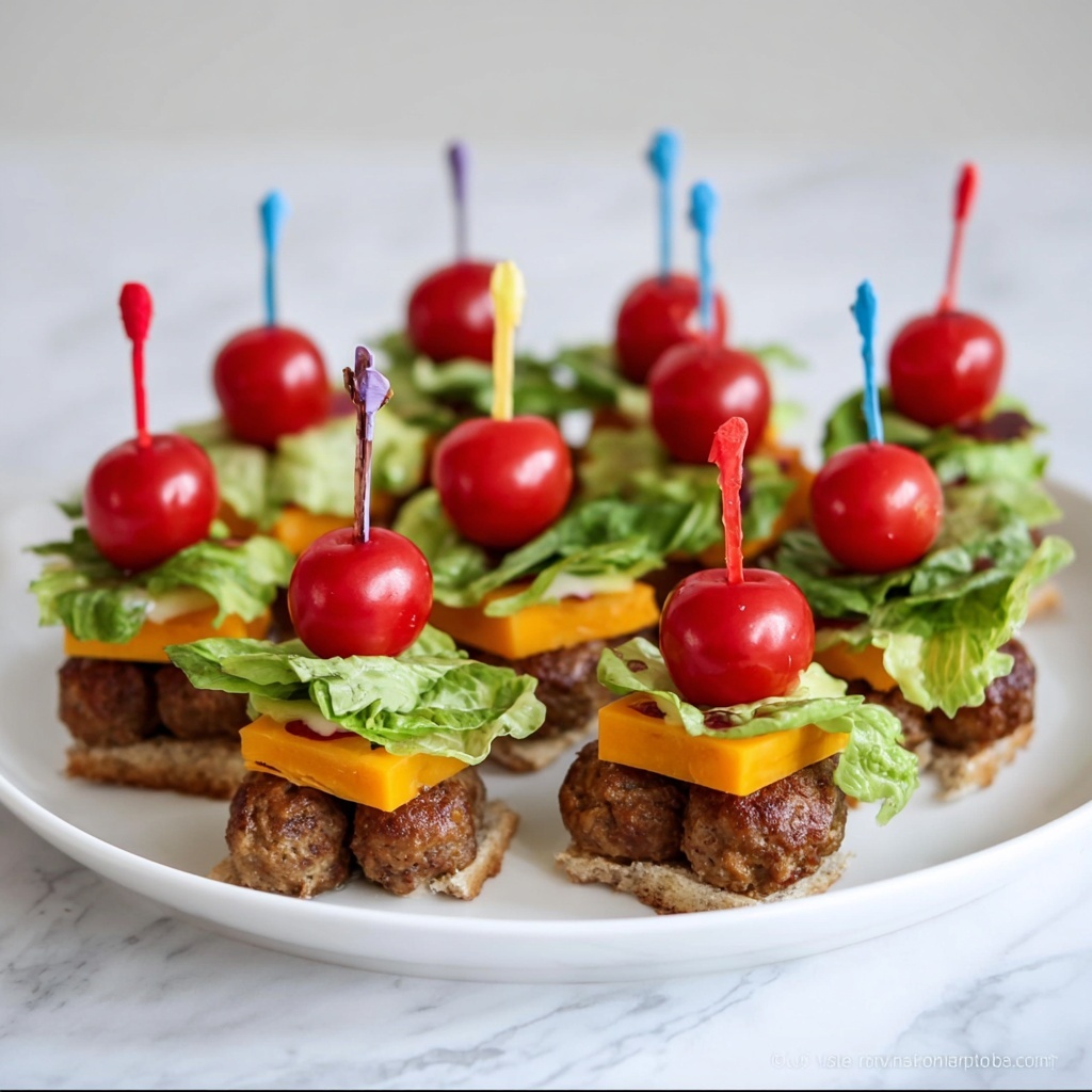 2. Assemble Bites: Stack each bacon cheeseburger bite by placing a cheese-topped meatball as the base, followed by a piece of crispy bacon, a small piece of iceberg lettuce, and finally top with half a cherry tomato. Secure each assembled bite with a toothpick to hold the layers together.