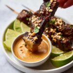 - Serve: Arrange grilled beef skewers on a platter. Drizzle with or serve alongside the warm Thai peanut sauce. Garnish with finely chopped peanuts, lime wedges, coriander leaves, and sliced red chili if desired.