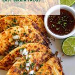 The final touches bring the dish to life. Serve your birria tacos with chopped yellow onion and fresh cilantro sprinkled on top for a fresh crunch and bright herbal notes. Don’t forget the lime wedges! A quick squeeze adds just the right pop of acidity to cut through the rich, savory meat, balancing every luscious bite perfectly.