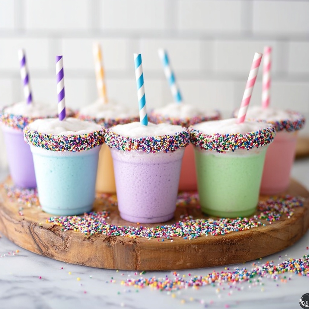 While the sprinkle-rimmed frosting provides plenty of flair, adding a small piece of fresh fruit like a strawberry slice or a mini candy sparkler on the rim can elevate the presentation even more. These simple garnishes add a fresh or fun twist and invite your guests to indulge in visual delight before the tasty sip.