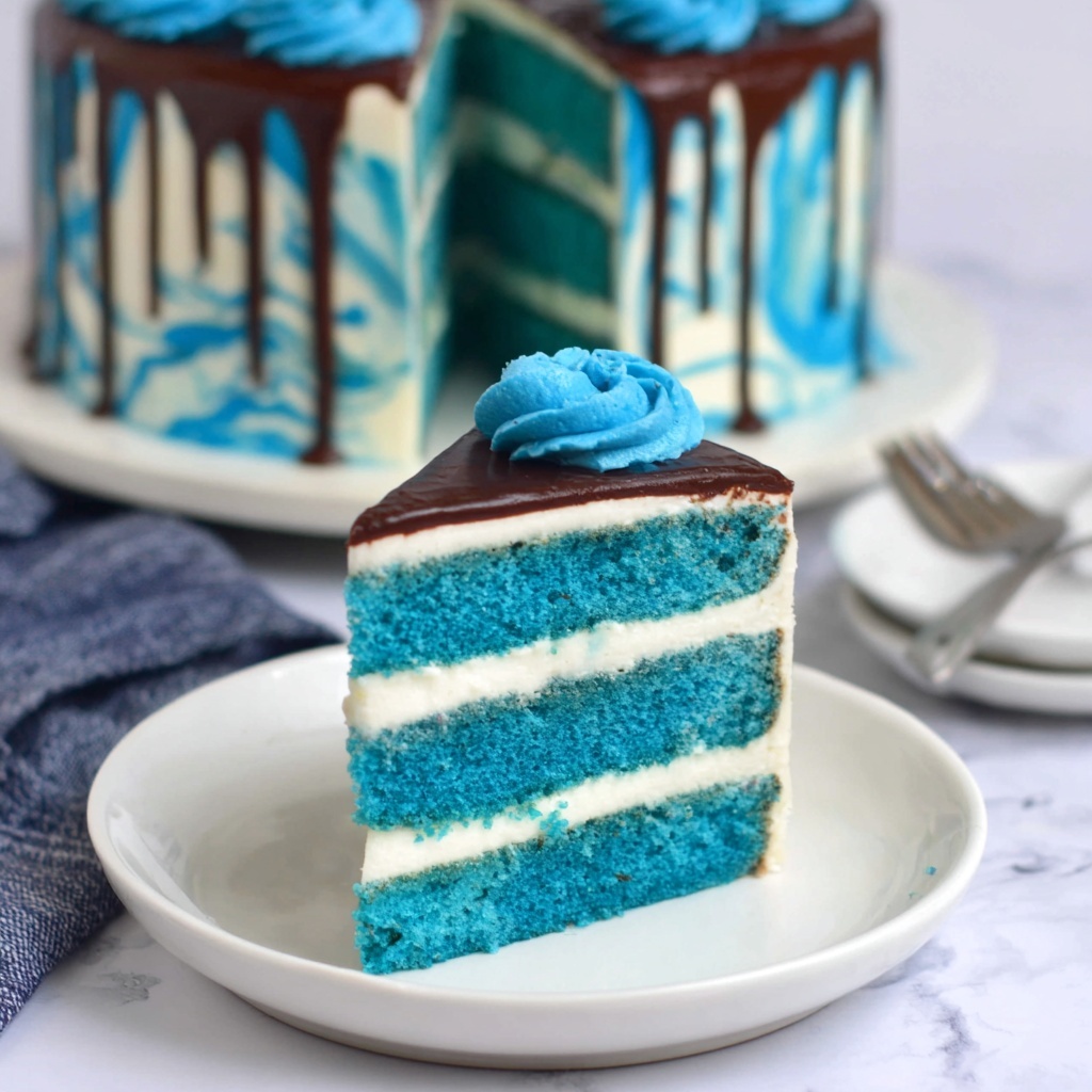 Try slicing the cake into elegant mini tiers for individual servings, or decorate with piped rosettes of blue and white frosting for a dramatic effect. This cake’s color and flavor make it ideal for themed parties or a stunning centerpiece at any celebration.