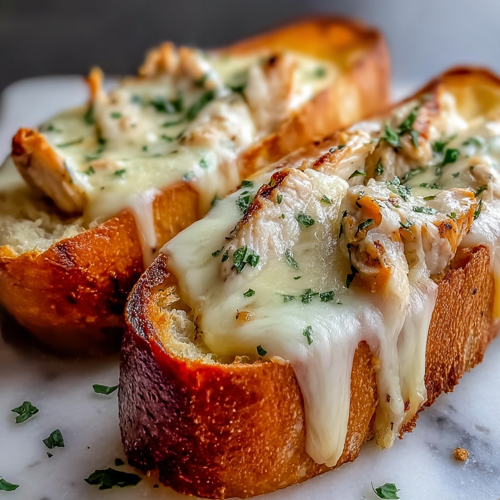 Take one slice of garlic bread and spread that luscious chicken filling generously across the entire surface. Don’t be shy here; covering every inch ensures each bite delivers a perfect blend of gooey and savory goodness.