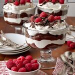 A decadent Chocolate Raspberry Trifle featuring layers of moist chocolate cake, rich chocolate pudding, fresh raspberries, and fluffy whipped topping. This dessert is perfect for holiday gatherings or special occasions, combining the deep flavors of chocolate with the bright sweetness of raspberries in an elegant layered presentation.