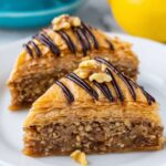 10. Cool and garnish: Let the baklava cool completely at room temperature to absorb the syrup fully, ideally for several hours or overnight. If desired, drizzle melted chocolate and sprinkle chopped walnuts on top for an extra decadent finish before serving.