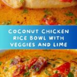 Fluff the coconut rice with a fork to separate the grains, then divide it evenly into bowls. Top each serving with the creamy coconut chicken and vegetable mixture. For added texture and nutty richness, sprinkle chopped peanuts over the top. A few extra cilantro leaves and lime wedges on the side make it all look inviting and add finishing touches to this stunning Coconut Chicken Rice Bowl Recipe.