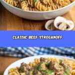 Classic Beef Stroganoff features tender strips of chuck roast simmered in a creamy mushroom sauce with onions, garlic, and a touch of Dijon mustard and Worcestershire sauce, served over egg noodles for a comforting and hearty meal perfect for family dinners.