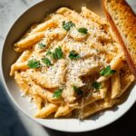 This creamy garlic penne pasta recipe combines perfectly cooked penne pasta with a rich and velvety garlic Parmesan sauce. Ready in just 25 minutes, it’s an ideal comforting meal that’s simple to prepare and sure to satisfy your cravings for a decadent yet easy pasta dish.