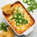 - Serve: Remove from the oven and let it cool slightly. Serve warm with tortilla chips and garnish with cilantro and jalapenos if desired for an extra burst of flavor.
