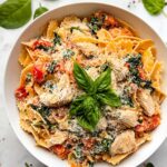 This Creamy Tuscan Chicken Pasta is a rich and flavorful one-pan dish that combines tender pan-seared chicken breasts with a luscious sauce made from heavy cream, garlic, sun-dried tomatoes, fresh spinach, and Parmesan cheese. Tossed with perfectly cooked penne or farfalle pasta and garnished with fresh basil, it offers a comforting and elegant meal perfect for weeknight dinners or special occasions.