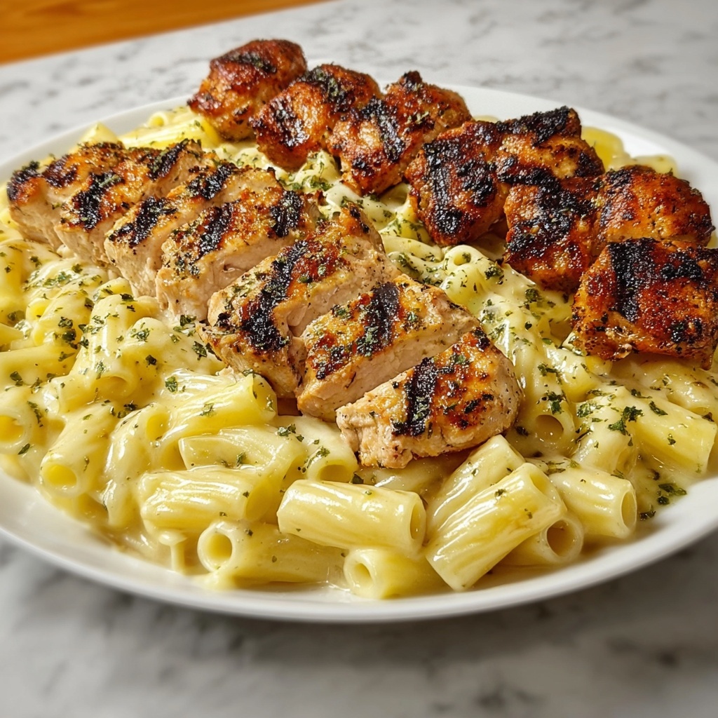 A rich and comforting dish featuring tender seared chicken thighs served over al dente penne pasta, smothered in a creamy Velveeta cheese and heavy cream sauce, finished with a flavorful garlic butter Parmesan topping. This easy-to-make recipe delivers a delightful blend of cheesy indulgence and savory herbs perfect for a satisfying weeknight dinner.