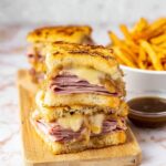These French Dip Sliders are a savory and delicious appetizer featuring tender roast beef, Swiss cheese, and caramelized onions on soft Hawaiian rolls. Brushed with a flavorful butter and Dijon mustard mixture, then baked until golden and melty, they are perfect for parties and gatherings. Serve with warm au jus for dipping to complete the classic French Dip experience.