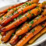 These glazed roasted carrots are a flavorful and tender side dish featuring sweet honey and savory garlic butter. Roasted to perfection, the carrots develop a caramelized exterior while remaining soft inside, making this recipe an ideal addition to any meal.