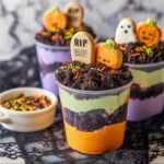 Sprinkle the top of each pudding creation generously with crushed Oreo cookies to mimic the “dirt” of your graveyard. Carefully cut the bottoms off Milano cookies and use a little food coloring and a fine paintbrush to write spooky messages like “R.I.P.” on them before standing them upright as gravestones. Complete your eerie scene with Halloween candy and colorful sprinkles spread around for that extra festive pop.