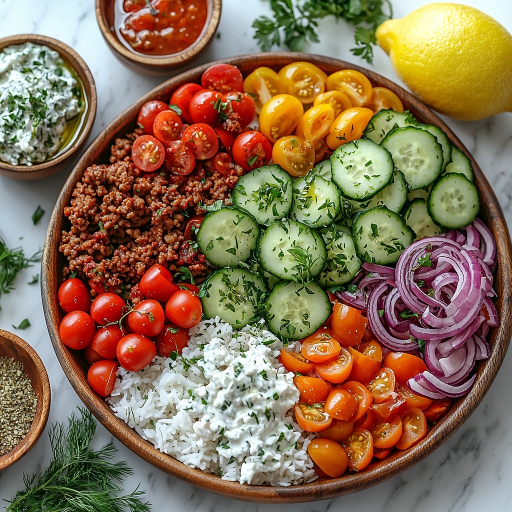 Make these bowls a feast for the eyes as well as the palate by arranging each component in colorful, distinct sections in a large bowl or plate. Layering the rice first, then target the turkey, followed by vibrant veggies and garnishes creates an inviting, mosaic-like appearance. For a casual gathering, serve all ingredients buffet-style and let everyone build their own customized Greek Ground Turkey Rice Bowls Recipe.