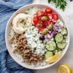 This Greek Ground Turkey Rice Bowl recipe offers a delicious and wholesome Mediterranean-inspired meal featuring tender ground turkey, fragrant basmati rice, and a fresh tomato-cucumber salad. Accented with herbs, feta cheese, kalamata olives, and creamy tzatziki and hummus, this dish combines vibrant flavors and nutritious ingredients for a satisfying and easy-to-make meal perfect for any day of the week.