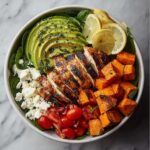 A vibrant and healthy Grilled Chicken & Sweet Potato Bowl featuring tender grilled chicken breasts, perfectly cooked sweet potatoes, fresh spinach, cherry tomatoes, creamy avocado, and tangy feta cheese, all served with refreshing lemon wedges. This bowl is perfect for a nutritious lunch or dinner that balances protein, vegetables, and wholesome carbs.