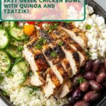 A vibrant and healthy Greek Chicken Bowl featuring tender, seasoned chicken breasts served over a bed of protein-rich quinoa, fresh vegetables like cherry tomatoes, cucumber, and red onion, complemented by Kalamata olives, crumbled feta cheese, and creamy tzatziki sauce. Perfect for a nutritious and flavorful meal that comes together quickly using stovetop cooking.