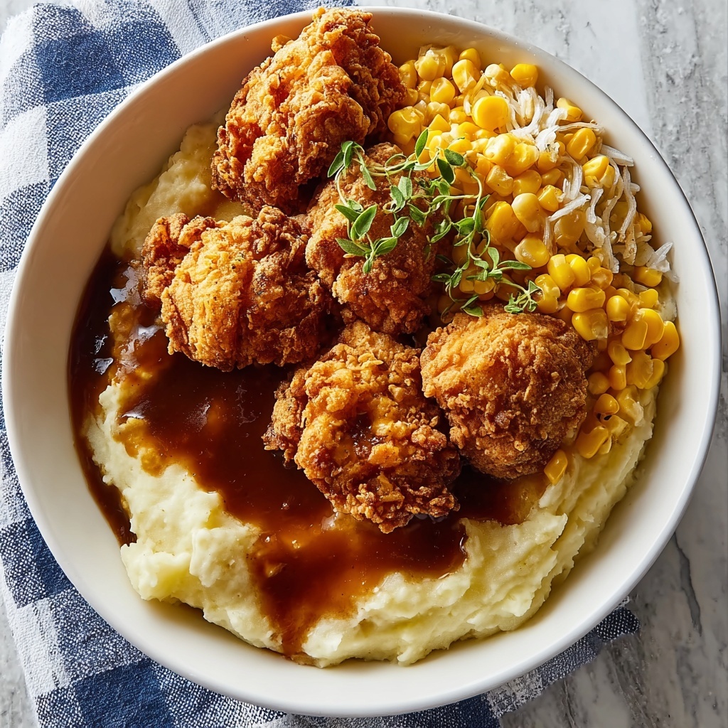 This Hearty Southern-Style Crispy KFC Bowl recreates the beloved crispy fried chicken bowl experience at home. Featuring juicy, buttermilk-marinated chicken fried to golden perfection and layered over creamy mashed potatoes, sweet corn, melted cheddar cheese, and smothered in savory brown gravy, this comforting dish is perfect for a satisfying meal that brings a touch of Southern charm to your table.