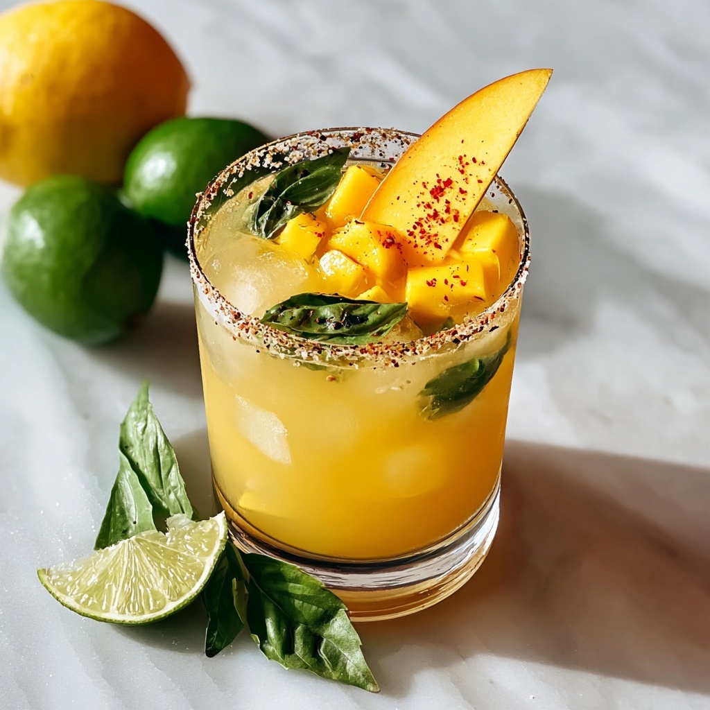Garnishes like a lime wedge and a fresh mango slice are more than just decorative—they complement the drink’s flavors by adding fresh citrus oils and fruity notes right at the glass’s rim. You can even consider a chili salt rim for extra zing.