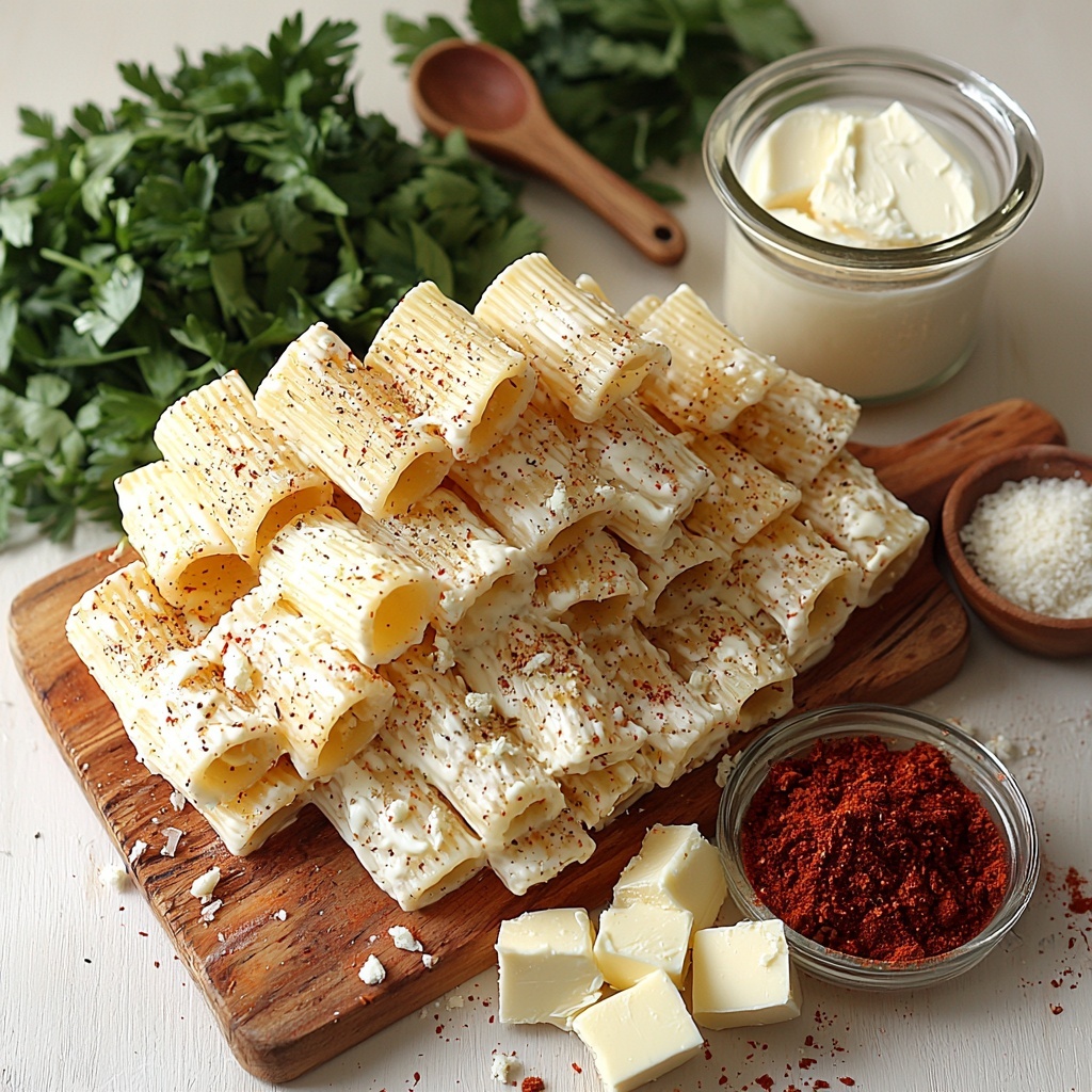 These ingredients are a perfect blend of simple yet essential elements that come together to create layers of flavor, texture, and color. Each item has its part to play, from the firm, sauce-holding rigatoni to the smoky Cajun-spiced chicken that brings depth and excitement.