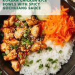These Korean Chicken Rice Bowls feature tender, marinated chicken thighs cooked to caramelized perfection and served over fragrant jasmine rice. With a spicy-sweet gochujang marinade and vibrant fresh vegetables like cucumber, carrot, and green onions, this dish offers a delightful combination of flavors and textures, bringing a taste of Korean-inspired comfort to your table in under an hour.