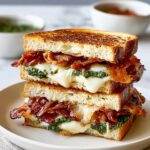 This Mind-Blowing Sun-Dried Tomato Pesto Grilled Cheese combines crispy sourdough bread with rich basil pesto, tangy sun-dried tomatoes, and gooey melted mozzarella or provolone cheese. Perfectly grilled to golden perfection, this sandwich delivers a burst of savory and cheesy flavors in every bite, making it an irresistible lunch or snack option.