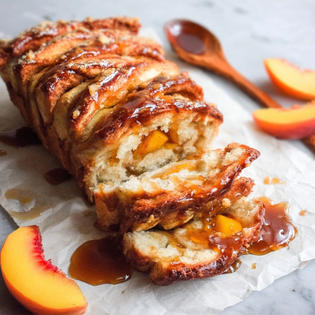 Delight in a warm, gooey Peach Pull-Apart Bread layered with cinnamon-spiced brown sugar and fresh peaches, baked to golden perfection and drizzled with a luscious homemade caramel sauce. This irresistible treat combines fluffy yeast bread with the juicy sweetness of ripe peaches and rich caramel, making it perfect for brunch or a comforting dessert.