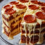 A fun and delicious twist on classic pizza, this Pepperoni Pizza Layer Cake stacks three pizza crusts layered with rich tomato sauce, melted mozzarella, Parmesan cheese, pepperoni, and optional toppings. Baked to bubbly perfection, it’s perfect for parties or a playful family dinner.