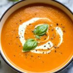 5. Garnish and Serve: Ladle the soup into bowls and garnish with a dollop of sour cream and additional fresh basil if desired. Serve hot and enjoy your comforting roasted red pepper soup.