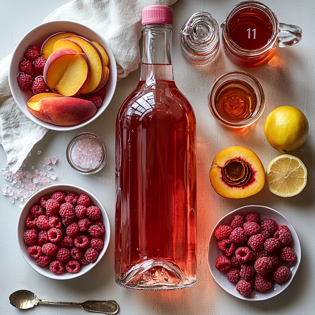 - Combine ingredients: Place the dry rosé wine, elderflower liqueur, brandy, fresh lemon juice, granulated sugar, peach slices, and raspberries into a large pitcher. Gently stir the mixture to combine the flavors without bruising the fruit.
