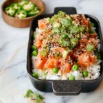 While the rice is cooling, dice your sushi-grade salmon into small, uniform cubes. Combine the salmon with soy sauce, sesame oil, sesame seeds, green onions, and chili flakes. Stir carefully to coat each piece without mashing, then refrigerate for 15 to 20 minutes to balance those flavors beautifully.