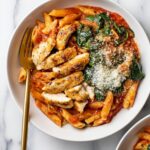 Top the spicy pasta with the sliced chicken strips. Serve immediately and sprinkle with freshly grated parmesan cheese if desired for that added layer of savory indulgence.
