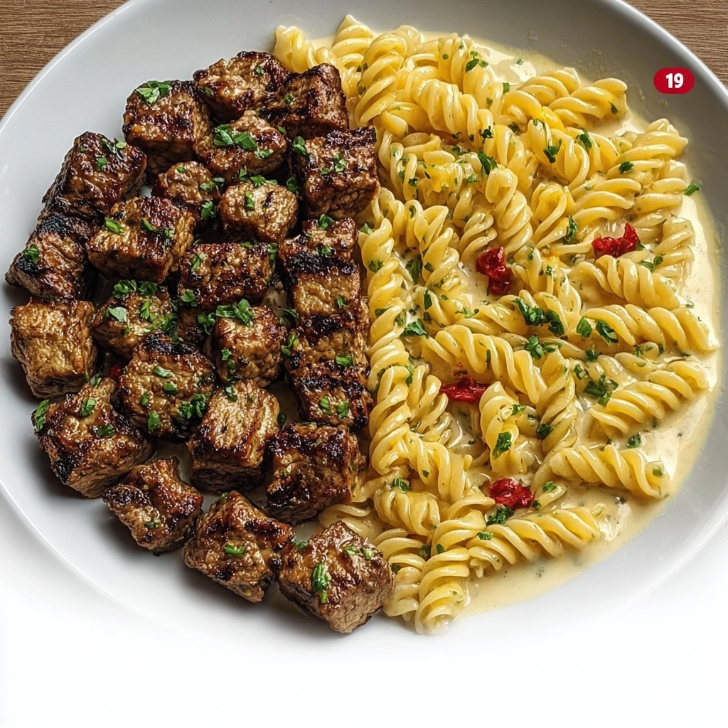 Steak Bites with Cheesy Garlic Parmesan Rotini Recipe