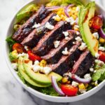 This flavorful steak salad recipe combines perfectly grilled flank steak with fresh vegetables and a tangy balsamic dressing, creating a balanced and delicious meal ideal for lunch or dinner. The steak is marinated and cooked to juicy perfection, complemented by crisp romaine lettuce, sweet corn, ripe avocados, and tangy feta cheese for a satisfying and healthy dish.