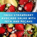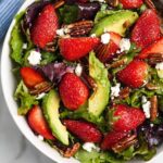 A refreshing and vibrant Strawberry Avocado Salad featuring a mix of spring greens, sweet strawberries, creamy avocado, crunchy toasted pecans, and tangy feta cheese, all tossed in a flavorful homemade poppy seed dressing.