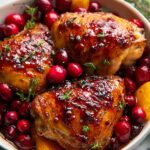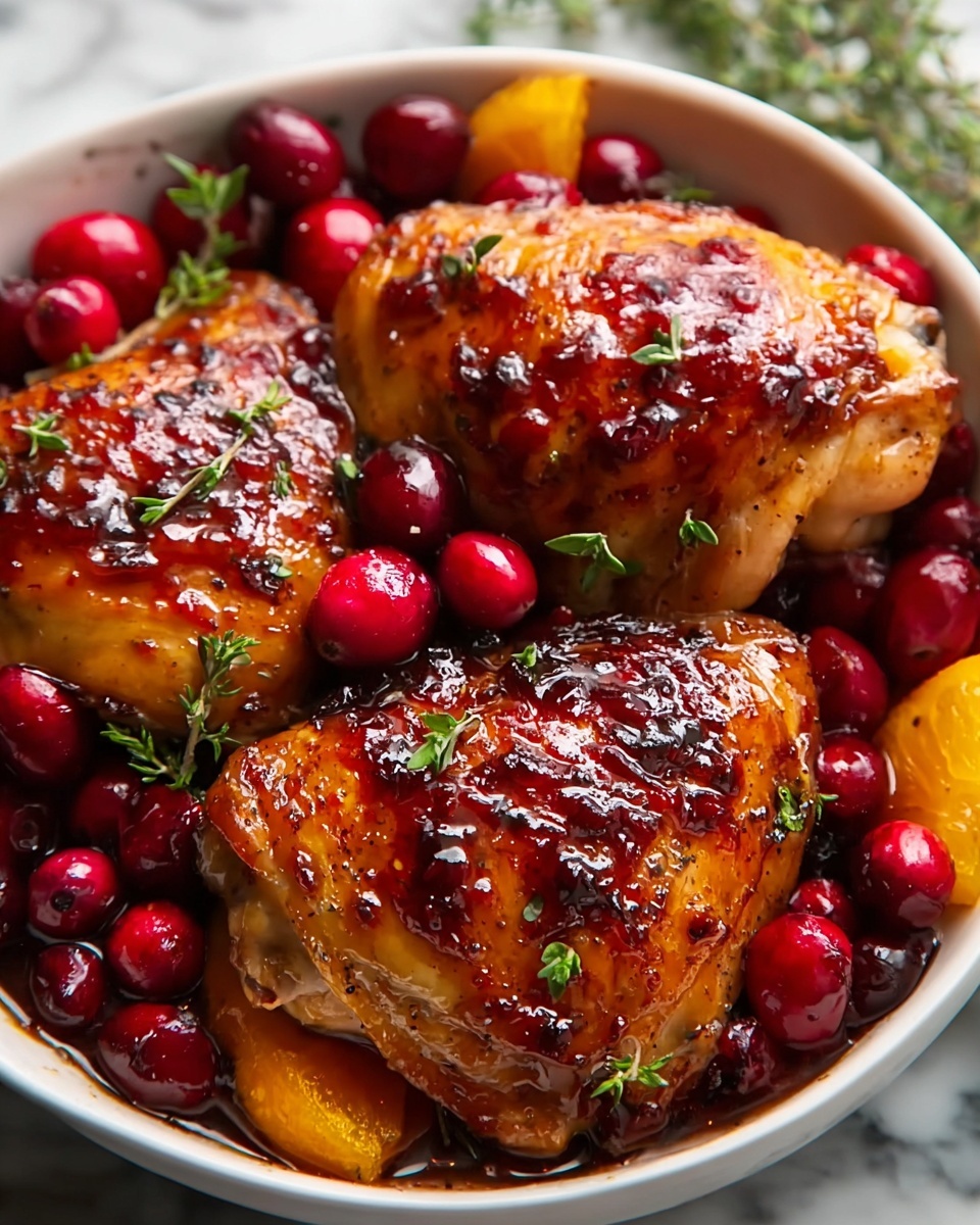 A deliciously sweet and tangy roasted chicken recipe featuring juicy bone-in, skin-on chicken thighs cooked in a vibrant cranberry orange sauce. Perfectly seared and oven-roasted to golden perfection, this dish is an ideal centerpiece for holiday dinners or any special occasion, pairing beautifully with wild rice, roasted vegetables, or fresh salads.