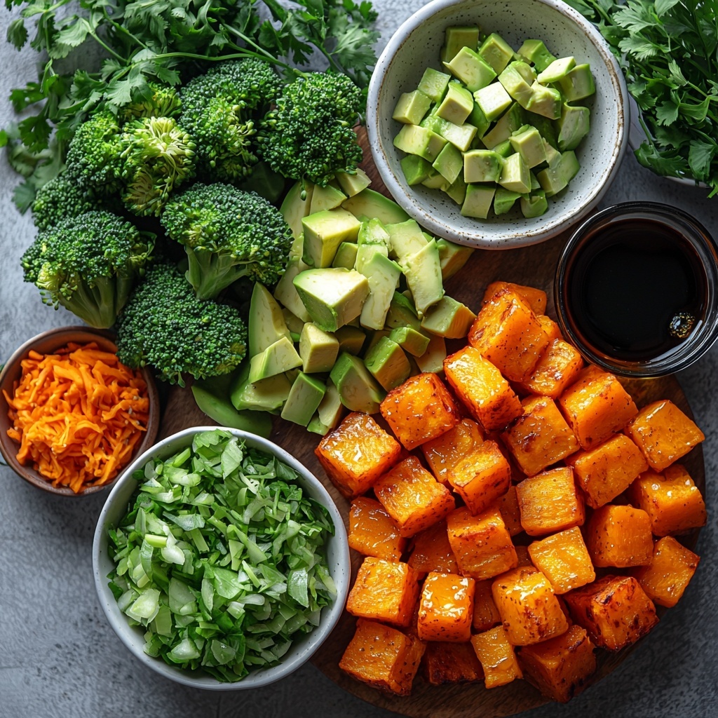 While the sweet potatoes roast, combine your broccoli florets, shredded green cabbage, grated carrots, and diced avocado in a large bowl. Toss them gently to mix without bruising the avocado. This mix adds wonderful texture and freshness, balancing the warmth of the roasted potatoes with a crisp, cool crunch.
