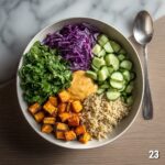 For a playful twist, serve this dish in colorful ceramic bowls or on flat plates layered artistically like a vegetable “canvas.” Adding edible flowers or even thinly sliced red chili peppers on top can turn this wholesome Buddha bowl into a stunning visual masterpiece that’s as beautiful to look at as it is delicious to eat.