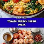 A quick and flavorful Tomato Spinach Shrimp Pasta recipe perfect for a healthy weeknight dinner. This dish combines tender shrimp, fresh spinach, and juicy cherry tomatoes tossed with spaghetti in a light garlic and broth sauce, finished with optional Parmesan cheese for added richness.