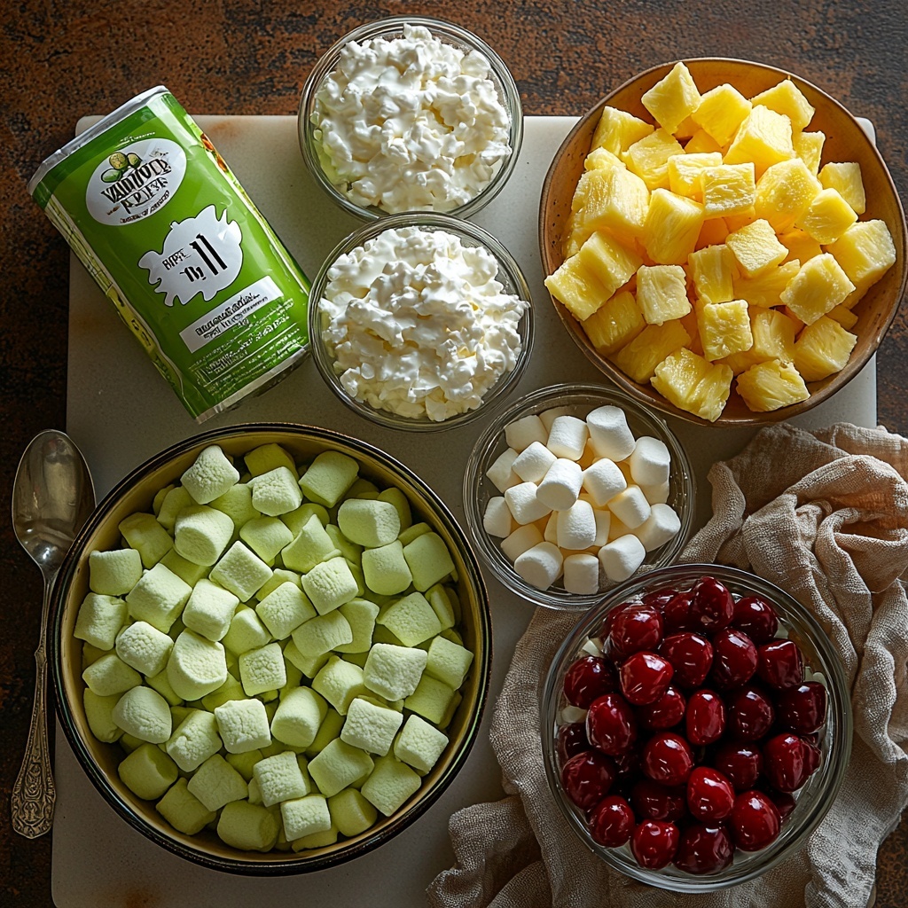 The magic of the Traditional Watergate Fruit Salad with Pistachios Recipe comes from a handful of straightforward ingredients that each play an important role. Every component adds a layer of flavor, from the sweet tang of crushed pineapple to the light fluffiness of whipped topping, creating a harmony that’s absolutely irresistible.