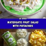 A classic and refreshing Watergate Fruit Salad featuring instant pistachio pudding, crushed pineapple, mini marshmallows, and whipped topping, garnished with crunchy pistachios and maraschino cherries. This easy no-cook dessert is perfect for potlucks, family dinners, or holiday gatherings.