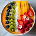 - Assemble the Bowl: Pour the smoothie mixture into a serving bowl. Arrange the fresh blueberries, raspberries, pineapple chunks, sliced strawberries, kiwi, raw coconut flakes, and granola attractively on top of the smoothie base to add texture, flavor, and visual appeal.