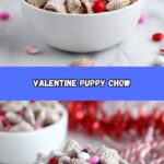 This sweet and crunchy Valentine Puppy Chow pairs wonderfully with a cold glass of milk or a warm cup of coffee or tea. It also complements other dessert treats like cupcakes or brownies, rounding out any Valentine’s Day spread beautifully.