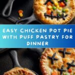 These Zombie Pot Pies are a fun and delicious twist on classic chicken pot pies, featuring a creamy chicken and vegetable filling topped with spooky puff pastry designs. Perfect for a festive meal, the pies combine tender shredded chicken, peas, carrots, and optional corn in a savory garlic-flavored sauce, all baked under golden, flaky pastry with Halloween-themed decorations.